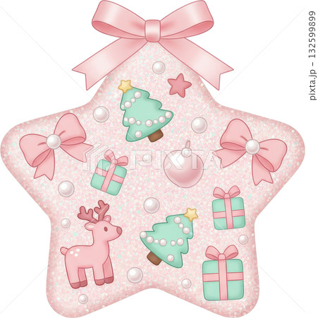 Whimsical pink glitter star ornament featuring Christmas trees gifts reindeer and bows