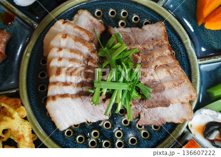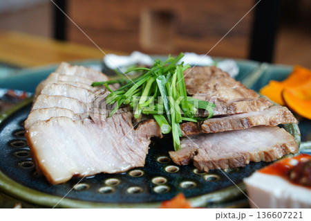 Traditional Korean Boiled Pork Belly Slices Bossam with Chives Garnish