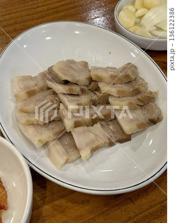 Suyuk, a traditional Korean dish of boiled pork slices, tender and juicy, often served with salted shrimp sauce, garlic, and ssamjang. Perfect for wrapping in lettuce for a flavorful, balanced bite.