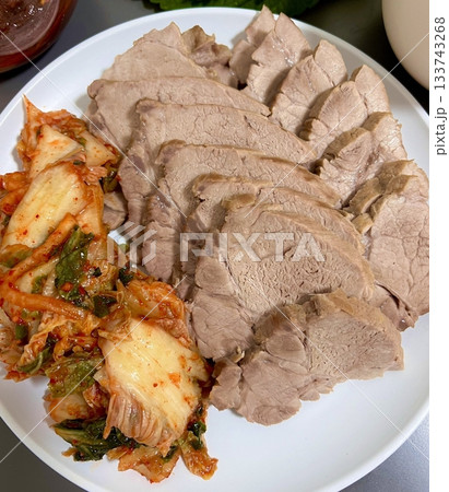 Korean Boiled Pork with Spicy Pollack Salad on White Plate