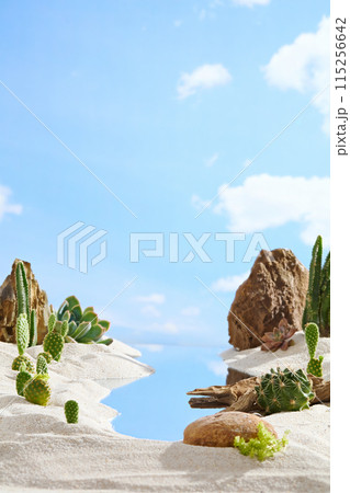 Vertical photo was shot from front angle with the scene of desert. A showcase podium of stone placed in the center of sand side next to various type of plants in desert. Sky background, copy space