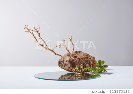 Minimalist template for promotional photo over light gray background, the blank glass showcase platform displayed in center of white table, a brown rock, a dry tree and some cacti decorated beside