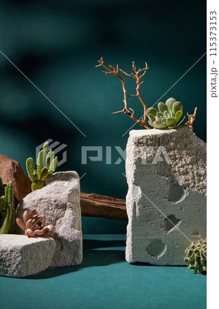 Photo of dark blue background has pattern, was shot from front angle. On both sides placing two light gray rocks with cactus decoration above, vacant space in center for product displaying