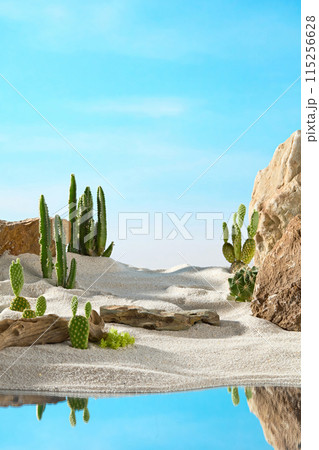A small puddle in the middle of the desert with many cacti growing in the sand around, in the behind is a white background. Blank space for product presentation and adding text