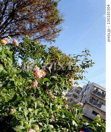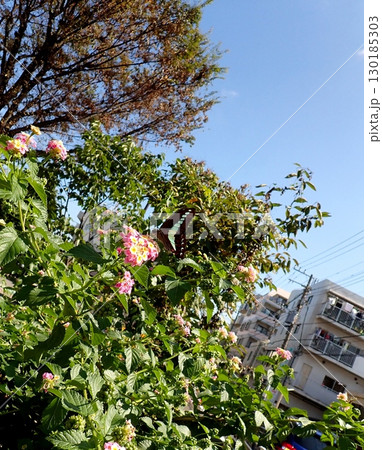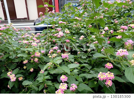 Vibrant orange and yellow lantana flowers blooming in a lush green garden