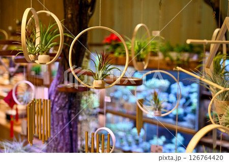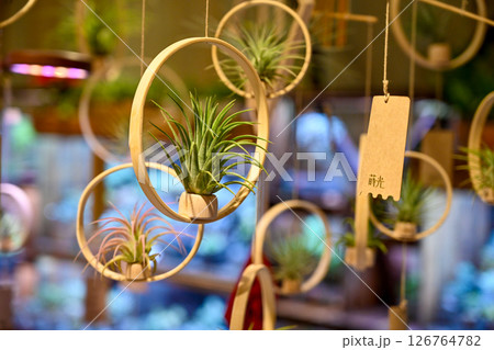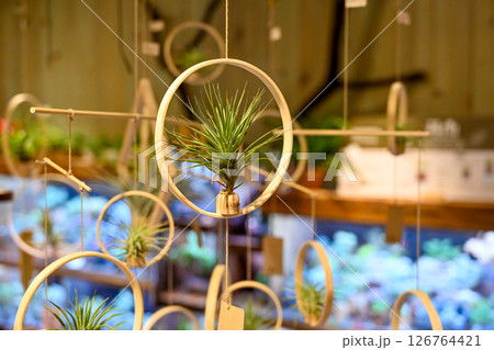 圓形木環上懸掛的空氣植物,陳列在以柔軟糕點為背景的植物店中,陳列在以日式圖案裝飾的植物為特色的現代化房間中。
