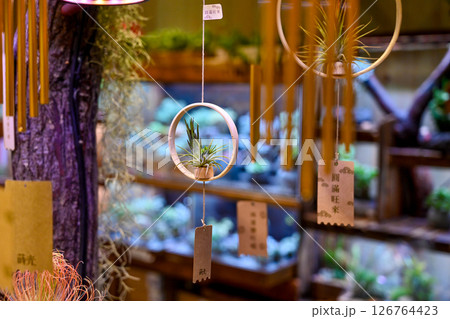 以空中圓形年輪中懸掛植物為背景展示,在一家看起來柔和的植物商店中,陳列在裝飾有日本圖案的現代房間中。