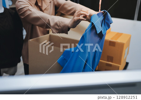Asian SME business women use laptop computer checking customer order online shipping boxes at home. Starting Small business entrepreneur SME freelance. Online business, Work at home concept.