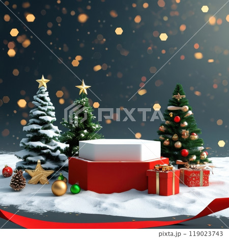 Festive 3D Christmas podiums with toy-inspired designs, featuring empty surfaces and diverse holiday decorations