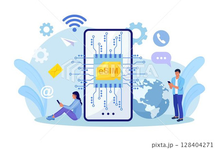 New digital technology. The sim card is embedded in the microcircuit. character using modern mobile phone with eSIM card chip. Young people use modern mobile phone with eSIM card chip
