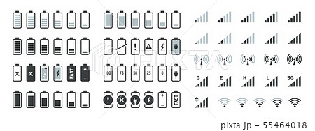 Battery icons. Black charge level gsm and wifi signal strength, smartphone UI elements set. Vector
