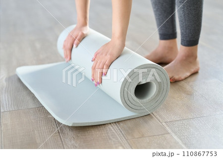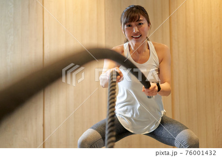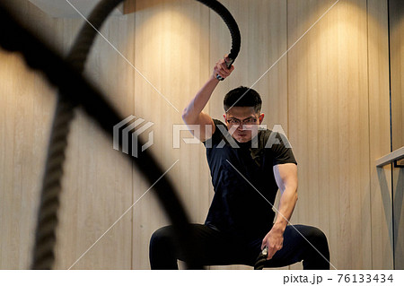 Close-up of Group of athletic young Asian people in sportswear doing squat and exercising at the gym.