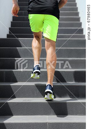 Stairs exercise fitess man running fast up the staircase for hiit cardio workout run at outdoor gym. Sport active athlete lifestyle training legs muscles.