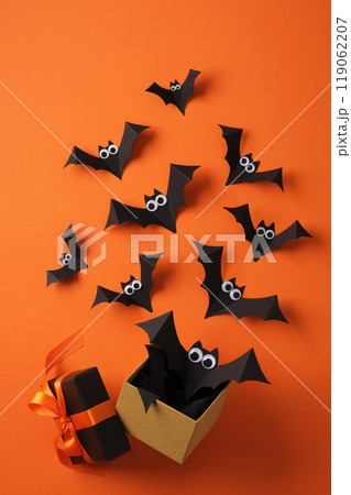 Paper bats with funny round eyes flying out of gift box on orange background. Background for Halloween cards, banners, invitations.
