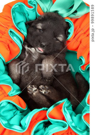 Happy puppy is lying in a Halloween basket.