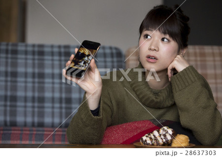 年輕女子在咖啡館裡給食物拍照