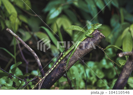 Young female green plumed basilisk lizard on tree branch in tropical rainforest of Tortuguero National Park in Costa Rica
