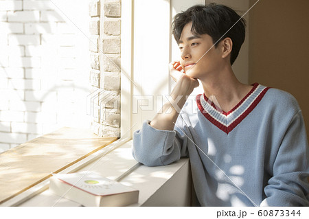 早晨放鬆的年輕女子在窗邊喝咖啡