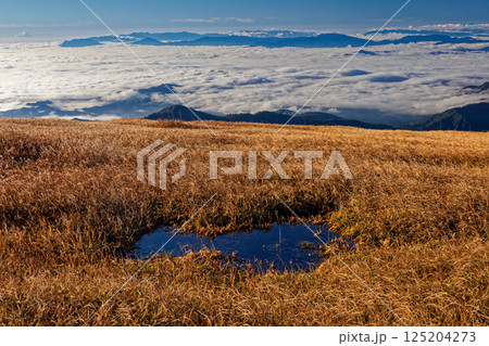 飯豐山脈、大西山脊的池塘和清晨的雲海