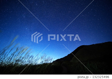 索尼高原上的日本蒲葦在夕陽下閃耀