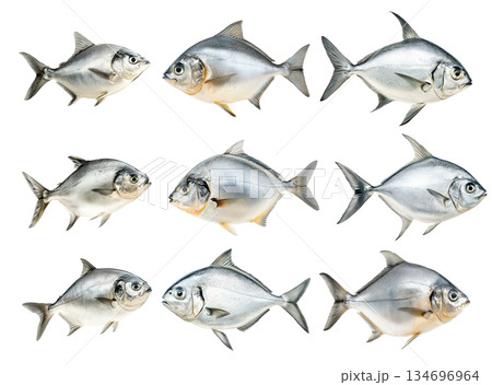Set of silver Pomfret fish with striking details of fins and scales isolated on white Transparent background.