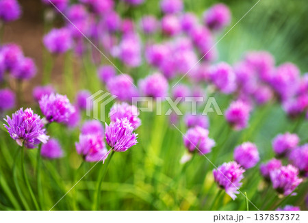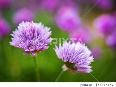 Allium hollandicum, group of purple persian ornamental onion flowers in bloom
