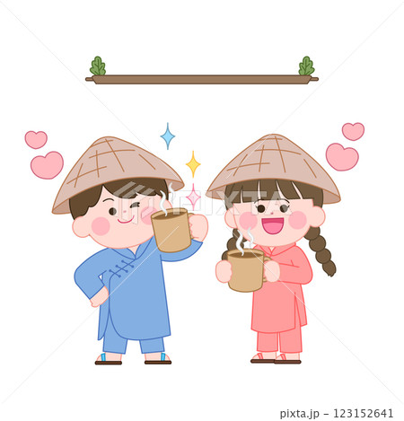 Cute characters wearing Ao Dai, the traditional Vietnamese costume, holding mugs.