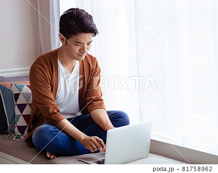 一個亞洲人寫的,他穿著不用的衣服,他用的是這本書和電腦。