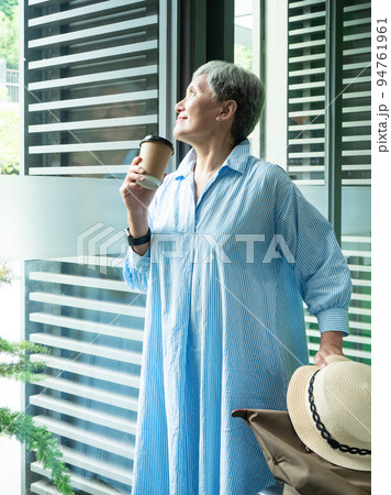 一位 60 歲的亞洲成熟女性戴著紙杯喝茶或喝咖啡,等待旅行或觀光的概念。