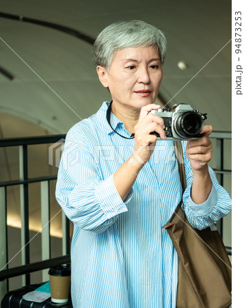 60 多歲的亞洲女性揮舞著單眼觀察機或底部單相機,旅行或觀光探索概念。
