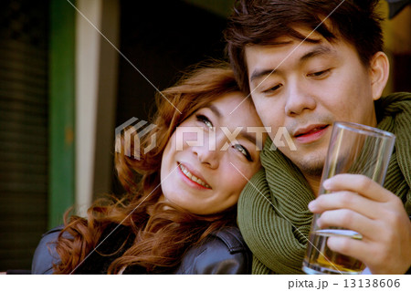 A lovely, happy young Asian couple is taking a selfie together while on a date at a coffee shop.