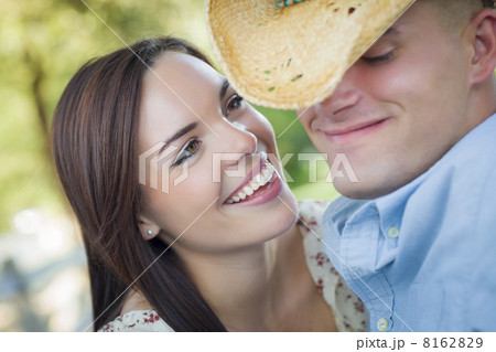 Mixed Race Romantic Couple with Cowboy Hat Flirting in Park