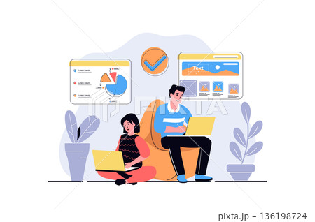 Freelance working web concept with cartoon people design. Woman making data analysis at laptop and man designing webpage while sits in armchair. Flat vector illustration isolated on white background.