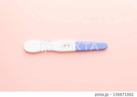 Positive urine pregnancy test on pink background. Pregnancy test kit measure hCG levels in urine.