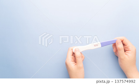Pregnant woman holding a positive urine pregnancy test on blue background. Pregnancy test kit measure hCG levels in urine.