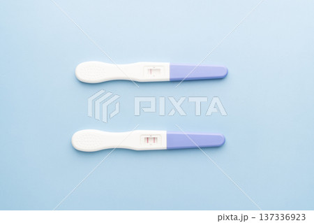 Pregnancy test with one and two stripes positive and negative results on blue background. Pregnancy test kit measure hCG levels in urine.