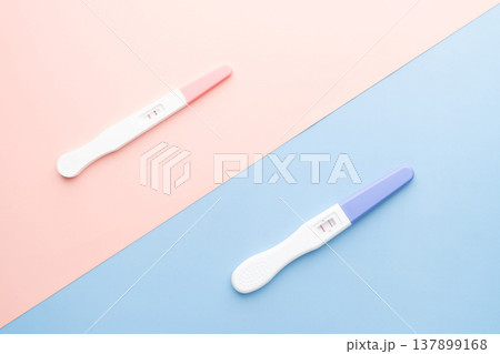 Positive urine pregnancy test on pink and blue background. Pregnancy test kit measure hCG levels in urine. Baby gender concept.