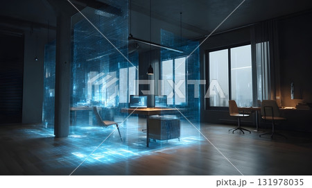 Holographic data visualization above table, showcasing future business intelligence with vibrant data projection and ample