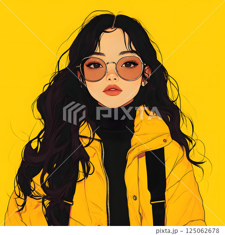 時尚的年輕亞洲女性。一幅具有醒目的黃色背景和時尚的肖像