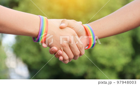 Holding hands with lgbt bracelets symbolizing love between gays or lesbians or tolerance