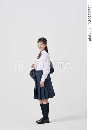 白色背景,日本國中女孩拿書包