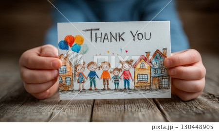 A child holds a colorful thank you card featuring drawings of kids and houses