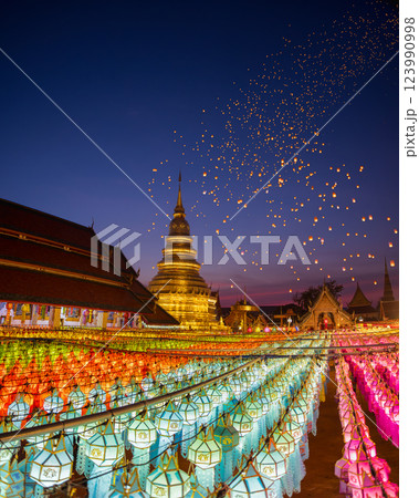 Paper lanterns in the Yee Peng Festival decorate around Lumphun downtown, Thailand.