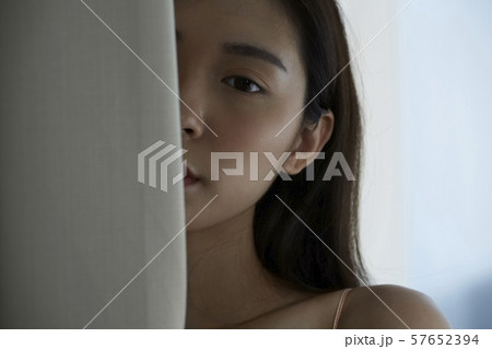 Thoughtful young woman with dark curly hair in an outdoor scene, looking pensive