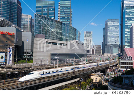 東海道新幹線和山陽新幹線 N700S「希望號、光號、迴聲號」列車穿過東京市中心的天際線。