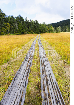 尾瀨、尾瀨之原和尾瀨沼的秋季徒步旅行,周圍環繞著秋天的楓葉,日本群馬縣