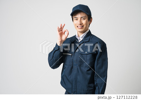 一名 20 多歲、身穿工作服的年輕男子做出「OK」手勢