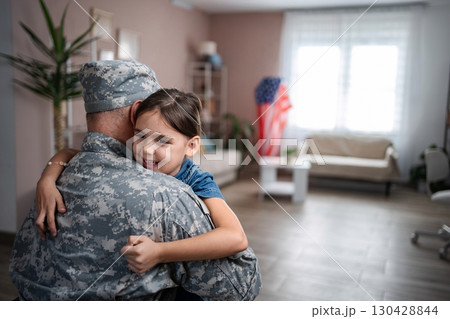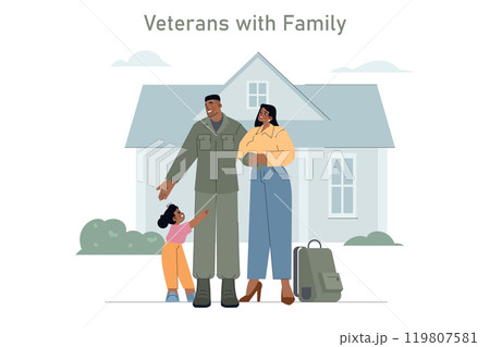 Salute to the Veteran concept. A heartwarming family reunion as a serviceman returns home to his spouse and child. Homecoming joy and military family life. Vector illustration.