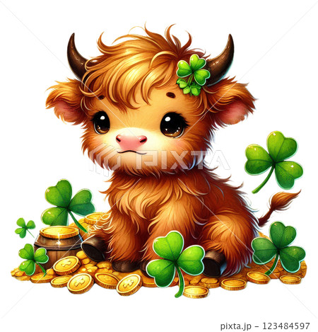 Cute St. Patrick Day Highland Cow Clipart. Irish Baby Highland Cow. Lucky Clover Festive Illustration