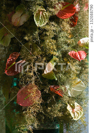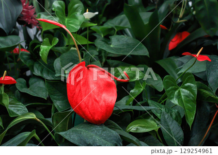 Big red Flamingo flowers growing in botanical garden. Colorful Anthurium scherzerianum wildflowers grow in summer green rainforest